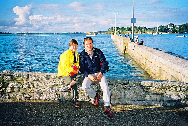 Samstagabend fängt es ziemlich stark zu regnen an, wir ziehen uns in die Campingplatz-Gaststätte zurück und hören von der einen Seite Oldies von der Stereoanlage, von der anderen Seite des Gastzimmers tönen die Kommentare eines Sportreporters aus der Flimmerkiste. Am Morgen spielt es dann wieder mal keine allzu grosse Rolle, ob das Zelt vom Tau, vom Kondenswasser oder vom Regen nass geworden ist. Heute haben wir wieder Aprilwetter erwischt: auf der einen Strassenseite Platzregen und auf der anderen Seite strahlender Sonnenschein. Natürlich Gegenwind, ist ja klar. Die Grande Marrée läuft immer noch, als wir aus dem Ort fahren kommt uns ein schier endloser Strom an Fahrzeugen entgegen. Was wollen die alle in dem kleinen Dorf? Alles Muschelsucher? Nun, uns soll's recht sein, wir fahren in die entgegengesetzte Richtung, leider heute hauptsächlich auf grossen Strassen, denn die Küste ist hier voller Buchten, Flussmündungen und Fjorde und wenn wir noch bis Locmariaquer kommen wollen, müssen wir damit leben, dass wir heute nicht allein auf der Strasse sein werden.