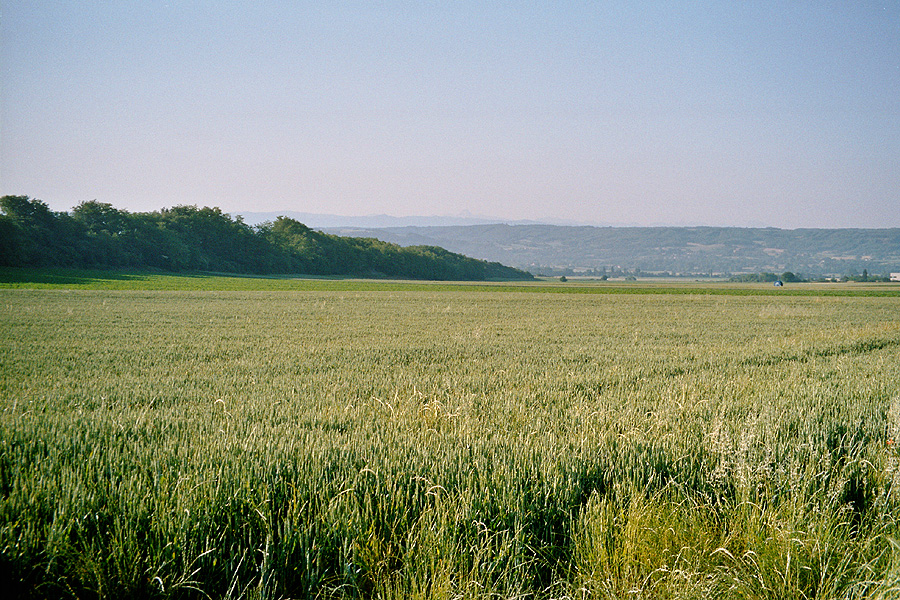 Es fängt schon gut an: wir sind schon um halb acht unterwegs und queren die Plaine de Bièvre auf einem leicht abschüssigen Weg im Morgenlicht. Uff, das ist ein Geschenk! Kaum treten, mit 25 KmH leise und leicht dahingleiten! Links die Ebene und die Schneeberge am Horizont, voraus baut sich allmählich der erste Höhenzug auf, den wir später überwinden werden. Zweimal können wir eine Kornweihe beim Jagen beobachten. Im Städtchen Thodure geht's aufwärts und aufwärts und aufwärts, wobei wir vom sonoren Schrei eines Pfaues begleitet werden. Nach langem Auf und ein bisschen Ab erreichen wir Le Grand-Serre. Hier gibt es eine grosse hölzerne Markthalle aus dem 13. Jahrhundert. Während wir im Schatten derselben eine Banane essen, kommt ein altes Männchen des Weges und erzählt von seiner Radfahrer-Laufbahn. Leider, meint er, machte irgendwann das Herz nicht mehr mit…hm...er wünscht uns "bon courage". Weiter geht es mehrere Kilometer den Berg hinan, aber was soll's: lieber so als unten im Rhônetal zwar flach dahinrollen, aber den Radlgenuss durch Lärm getrübt zu wissen und sich über den Schwerverkehr zu ärgern. Allen Unkenrufen zum Trotz erweist sich die Streetmachine als hervorragend bergtauglich - zumindestens für meine Art und Weise, Steigungen zu erklimmen. Im leichtesten Gang trete ich ruhig und gemütlich vor mich hin und konzentriere mich lieber auf die Dinge am Wegesrand, so zum Beispiel auf das Rebhuhn, dass recht lange braucht, bis es endlich vor mir die Flucht ergreift. Oder die vielen Mohn- und Kornblumen, die farblich so schön mit den allmählich vom grün ins gelb wechselnden Getreidefeldern harmonieren.