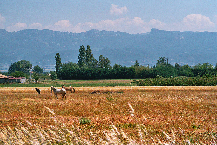 Was sich gestern schon im Aussehen der Häuser andeutete und nun manifestiert, spiegelt sich nach St. Donat-s.-l'Herbasse auch im Erscheinungsbild der Landschaft wieder: wir sind in Südfrankreich angekommen! Die Vegetation ist nun eine Spur weiter voran: das Getreide ist leuchtend gelb, das Gras ausgebleicht, manchmal schon verbrannt. Bleiern wölbt sich der Mittagshimmel über dem Land, es ist recht beschwerlich, sich nun gegen den Wind voran zu arbeiten. Wir queren die Isère bei Chateauneuf-sur-Isère. Liebe Begegnungen sind die Pferdeherde auf einer grossen Weide, die forsch und neugierig auf uns zukommt, als wir anhalten um die schönen Tiere zu bewundern. Oder das Kamel und die Ponys ein paar Kilometer weiter.