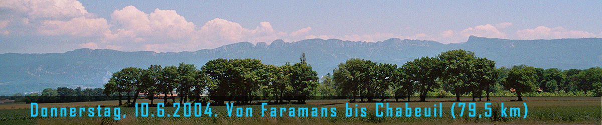 Leider haben wir nicht mehr die Energie, das Dörfchen Alixan bzw. dessen Kirche zu besichtigen, die sich so herrlich vom Bergmassiv am Horizont abhebt. Um ehrlich zu sein, sind wir im Augenblick sogar ziemlich am Ende und schleppen uns seit den letzten zehn Kilometern nur mehr so dahin und machen Strecke. Dummerweise ist der angepeilte Campingplatz in Chabeuil auch noch einige Kilometer ausserhalb dieses Ortes hügelan Richtung des soeben erwähnten Bergmassives gelegen. Als wir dort ankommen, entpuppt sich der Platz erstmal als grosse Enttäuschung, denn es ist steinig, so dass ich keinen Zelthering in den Boden bekomme. Ausserdem sind die Parzellen recht eng. Rentnerpaare und Familien mit Kleinkindern betrachten uns Vagabunden mistrauisch - wie vorher in Staad. Aber nachher sitzen wir im Restaurant und beobachten das aufgedrehte Personal, dass vor lauter Spässen und Slapstick-Einlagen fast gar nicht zum Arbeiten kommt und machen zudem die Bekanntschaft eines amerikanischen Ehepaares, das ebenfalls mit dem Rad unterwegs ist. Die beiden sind in fünf Wochen von Rom aus hierher geradelt und haben nun noch mehr als vier Monate Zeit, um mit ihrem Tandem bis ans Nordkap zu radeln…uff…sowas weckt Bedürfnisse und Wunschträume…