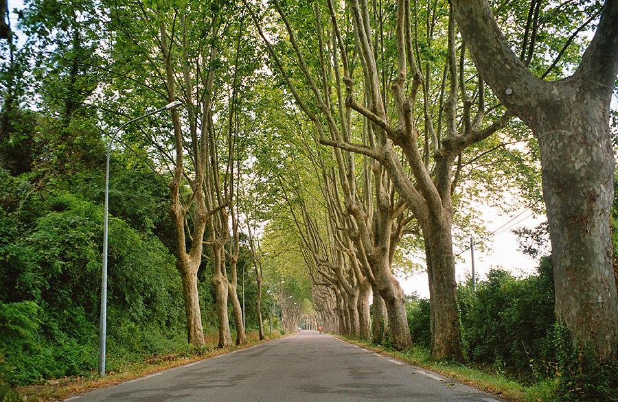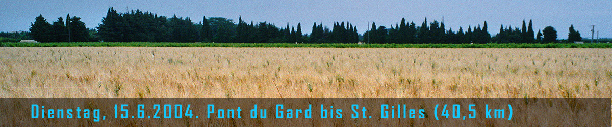 Die Platanenallee, auf der wir die ersten Minuten entlangrollen, könnten von Dali gemalt sein: die Zweige und Äste sind bis weit nach oben zurückgeschnitten. Es sieht aus, als ob man Dali's Elefanten umgedreht und auf den Rücken gelegt hätte. Ein Weilchen kämpfen wir wieder mit dem wütenden Tier des Verkehrs (so kommt es einem vor), dann nimmt uns eine kleine Strasse auf und geleitet uns durch ebenes Land. Abwechselnd brach liegendes Ödland, goldgelbe Weizenfelder und Weinanbau. Immer aber ein kleines Pinienwäldchen oder dunkelgrüne Zypressen im Blickfeld. Wir sind inzwischen im Languedoc, die Provence liegt offiziell hinter uns. |