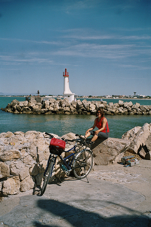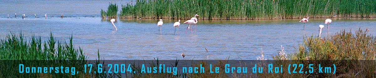 jetzt noch die Zehen in die Fluten des Mittelmeeres strecken! Wir radeln die paar Kilometer am Kanal entlang, der Aigues-Mortes mit dem Meer verbindet und sehen etliche Flamingos in einem Teich auf Nahrungssuche. Es riecht nach Meer, nach Fisch, nach Salz. Bei Le Grau du Roi erreichen wir das Meer. Die Stadt selber ist eine Touristen-Hochburg: ein Städtchen mit Altstadtkern, aber auch vielen modernen Hotels und Ferienwohnungen, Cafés, Restaurants, Boutiquen und alles, was des Touristen Herz begehren könnte. Der Trubel hält sich jetzt in der Vorsaison noch in Grenzen und man ist damit beschäftigt, alles für die kommenden turbulenten Wochen vorzubereiten. Da wird gestrichen und gehämmert und repariert. Irgendwie ist das recht sympathisch, uns gefällt's. Eine gute Portion Touristenrummel mag ich schon vertragen. Das Meer glitzert in der Sonne und die Angler, Spaziergänger und Sonnenanbeter gehen ihren Lieblingsbeschäftigungen nach. In der Ferne sieht man die grossen Betonburgen anderer Touristenorte, zb. Von La Grande Motte. Also dorthin will ich jetzt nicht Freitag, 18.6.2004. Rückreise nach Zürch. Wir müssen heute früh raus, denn unser Zug von Aigues-Mortes nach Nimes geht um 6:48. Und dann sitzen wir mehr oder minder den ganzen Vormittag auf dem grossen Bahnhofvorplatz in Nimes in einem Strassencafé herum. Es ist relativ ruhig hier, nicht so hektisch, wie vermutet. Das Thema Velomitnahme im TGV beschäftigt uns und irgendwie können wir es fast nicht glauben. Margrit erkundigt sich nochmals hier am Bahnschalter und kommt prompt mit einer Negativmeldung zurück: Velos dürfen auf keinen Fall mit in den Schnellzug, aber wir können's ja mal probieren. Uff was soll man nun glauben? |
