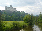 Burg über den Ortschaften auf die Felsvorsprünge gebaut. Bei