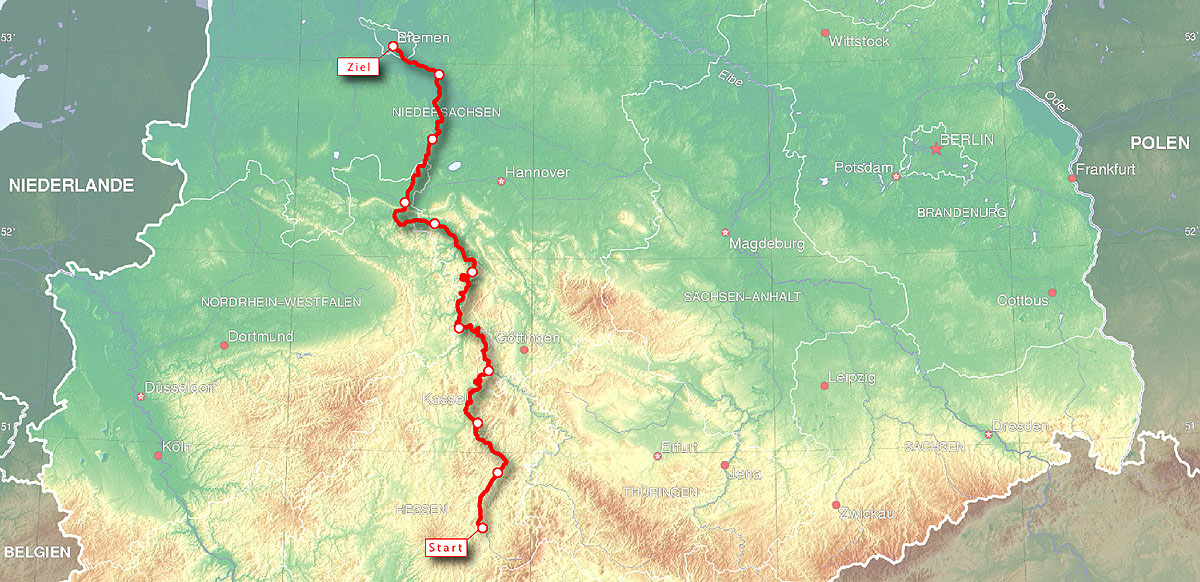 Für jemanden, der sein Heimatland nur von der Autobahn her kannte, es sogar als lästiges Hindernis auf dem Weg in die Feriendestination betrachtete, war es durchaus eine erstaunliche Erkenntnis, dass es auch in Deutschland Gegenden gab, die den früheren Reisezielen an Sehenswürdigkeit in nichts nachstanden. Ich rollte das Fulda- und später das Wesertal hinab, zeltete am Steinhuder Meer und später, in Schleswig Holstein, am Plöner See, unternahm ich die erste Radtour seit meiner Jugendzeit mit einem Leihrad. Seitdem "verfolgen" mich Fulda und Weser. Im Jahr 1997 führte uns dann eine unserer ersten Radreisen durch dieses Flusstal und nun ist es an der Zeit, das zu wiederholen.