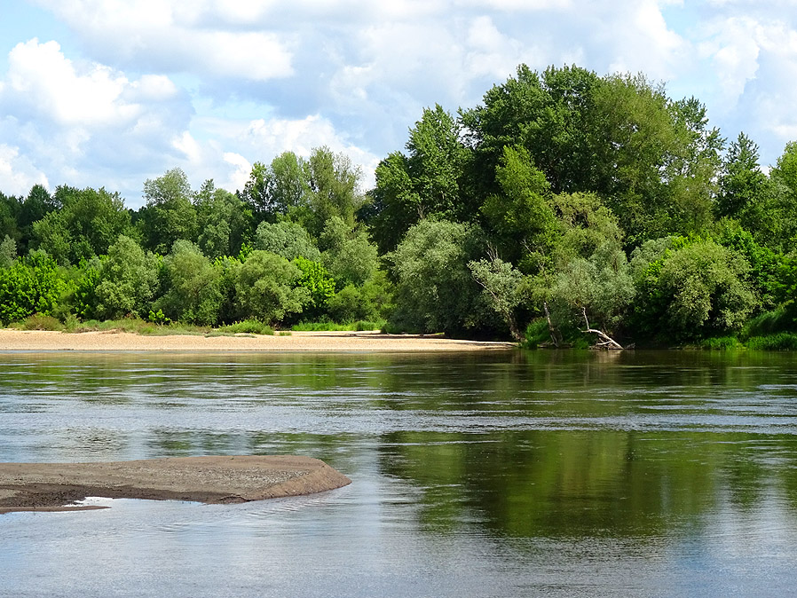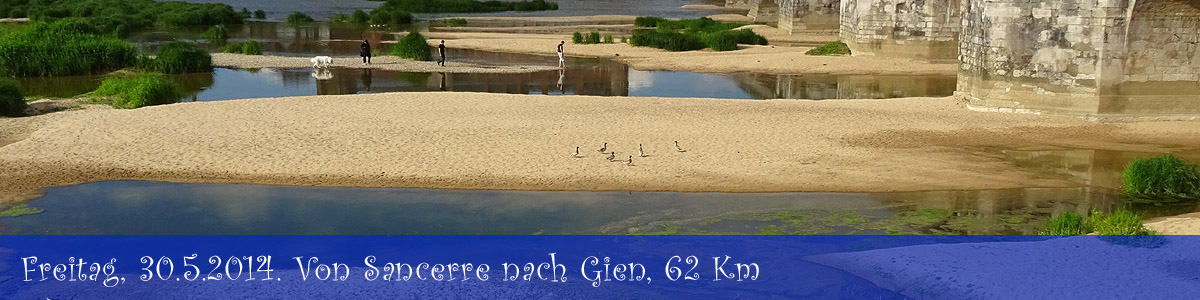 Wir blicken auf eine Etappe zurück, die wieder mit strahlend blauem Himmel beginnt. Zuerst gleiten wir vorsichtig inmitten all der zur Arbeit fahrenden Automobilisten auf der grossen D 955 hinunter in den Ort St. Satur, wo wir zuerst einen Supermarkt aufsuchen, um unseren Vorrat an Lebensmitteln und Trinkwasser wieder aufzufüllen. Dann folgen wir wieder den Radwegweisern und tun gut daran. Wie gestern schon hat man vor uns ein Asphaltband entrollt, auf dem sich prima radeln lässt, zumal an diesem sonnigen Frühsommermorgen. |