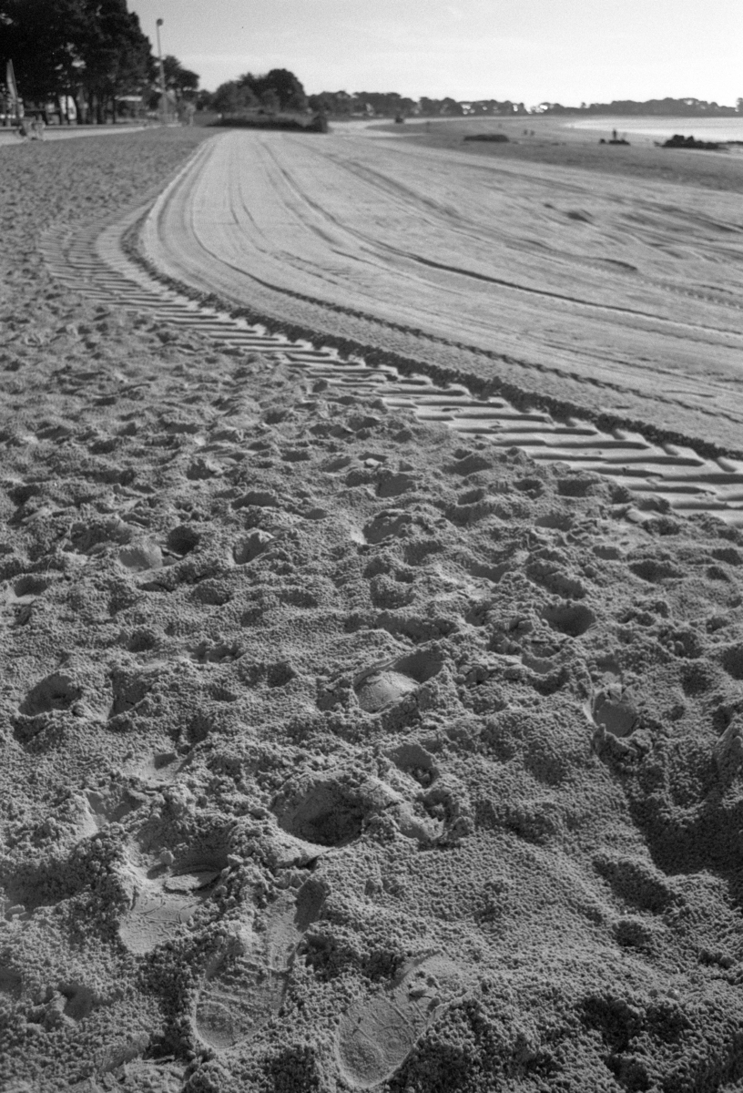 ...und beobachten den Städtischen Angestellten, der den Strand säubert und planiert.