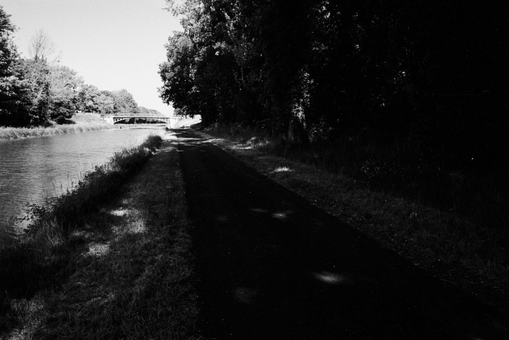 ein Loch in Margrits Pneu. Parbleu! Man flucht, man schwitzt, man flickt - ein Reissnagel steckt noch frech im Mantel des Vorderrades. Ein Sabotageakt? Endlich können wir losziehen und noch etwa zehn Kilometer am Damm des Sees entlang fahren. Das ist dann aber auch richtig schön, in der blauen Morgenstimmung und mit dem kräftigen, noch halbwegs kühlenden Wind. Bei Arrigny überqueren wir die Marne und bei Orconte treffen wir auf den Canal entre Champagne et Bourgogne, dem wir nach Vitry-le-François folgen. Eine eher langweilige Angelegenheit jetzt, immerhin erleichtert durch den Rückenwind und die schillernden Libellen, die immer ein paar Meter vor mir dicht am Boden fliegen. |