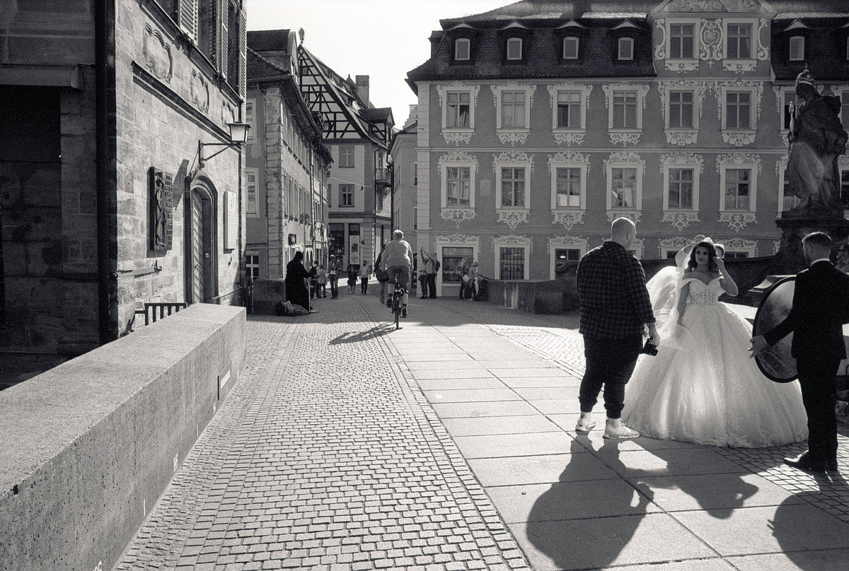 durch. Dass man müde ist, merkt man auch an der schwindenden Konzentration. Als ich vor unserem Hotel meine Lenkertasche vom Rad nehme, fällt mir prompt meine antike Minolta auf den Boden und handelt sich zwei unschöne Dellen ein. Immerhin funktioniert sie noch. Natürlich wandeln wir heute nach der Siesta noch durch Bambergs Gassen und Strässchen, die Stadt ist schliesslich ein Bijoux. Im Café Müller essen wir nicht nur hervorragend, eine Zwei-Mann-Band baut auch grad ihr Instrumentarium auf und intoniert zum Soundcheck "The Year of the Cat" von Al Stewart. Warum nur werden heute keine so geheimnisvoll-schönen Songs mehr geschrieben? Eine Weile später kommen wir noch in den Genuss einiger Beatles-Songs, die eine Band auf dem Weinfest in der Innenstadt spielt. |