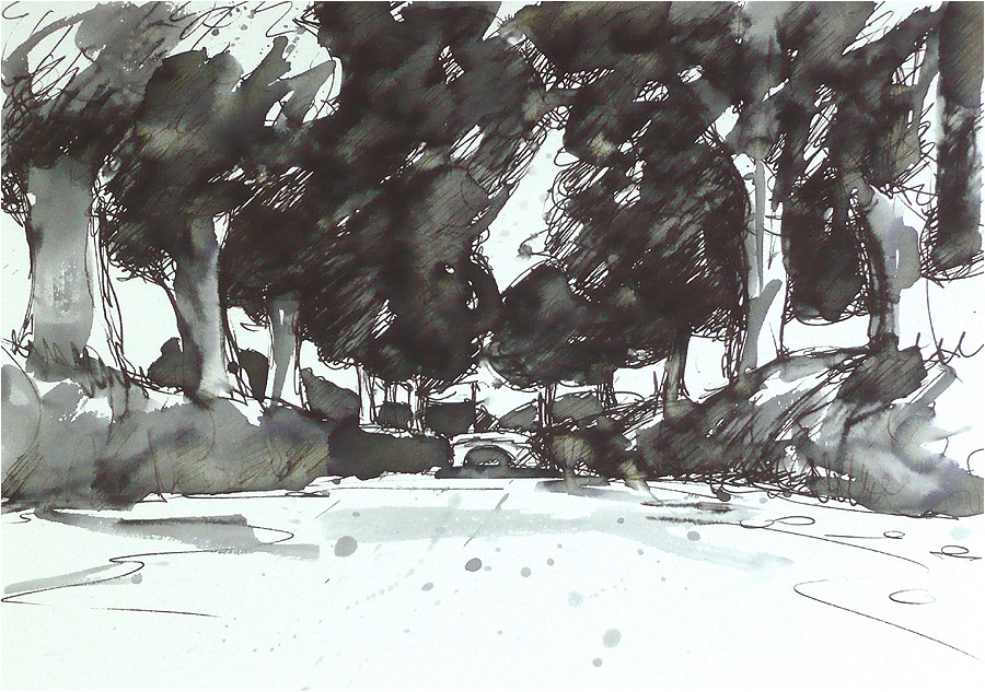 | Zeichnungen (Tinte auf Papier, mit Wasser laviert) zurück |