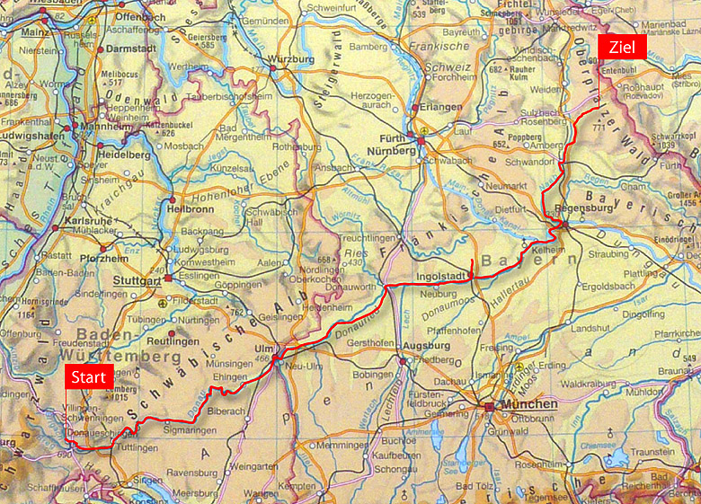 Heute morgen schaue ich wehmütig auf die Donau zurück, die wir jetzt leider verlassen müssen. Ich weiß noch, wie ich am ersten Tag über ein Messingschild mit der Aufschrift “Budapest -1250 km” lächeln mußte, daß kurz nach Donaueschingen im Boden eingelassen war: heute würde ich gerne weiterfahren, einfach soviel Zeit übrig haben, um bis nach Ungarn zu gelangen. Naja, ein andermal vielleicht, jetzt liegt erstmal das Naabtal vor uns, bekanntes und unbekanntes Gebiet zugleich. Erstaunlich schön und ruhig ist das Flußtal, als wir uns nach Norden an Kallmünz heranpirschen. Kallmünz selbst ist ein Kleinod am Fuße steiler Kalksteinklippen. Langsam wird die Gegend heimatlich: Burglengenfeld, Schwandorf (wo wir auf einer Kirmes Bratwürste essen), Schwarzenfeld. In Schwarzenfeld verabschieden wir uns von der Naab und biegen rechts ins Schwarzachtal ab, wo es zu meinem Erstaunen einen ausgeschilderten “Schwarzachtalradweg” gibt. Bis Zangenstein läuft alles noch wie am Schnürchen, doch hier müssen wir wohl oder übel auf die Landstraße wechseln, da es bis Oberviechtach noch keinen Radweg gibt. Anstrengend wird dieser letzte Abschnitt in dreierlei Hinsicht: erstens gibt es seit Schwarzenfeld keine Einkehrmöglichkeit mehr, zweitens wird es jetzt recht hügelig und drittens sind wir nicht mehr ganz taufrisch an diesem letzten Reisetag. Besonders dem Vater macht dieses letzte Stück zu schaffen. Mich packt aber der Ehrgeiz und ich mobilisiere meine letzten Reserven und radle den beiden einfach voran. Als ich zuhause eintreffe, macht sich Ernüchterung breit: es ist vorbei, leider! Die Eltern treffen auch ein, packen ab, stellen die Räder in die Garage, kommen ins Haus, wir wissen gar nicht so recht, was wir sagen sollen, der Alltag nimmt schon wieder Anlauf in Form von Aufräumungsarbeiten... Abends rufe ich Rita an, melde mich gesund zurückgekehrt und versuche ihr das Erlebte zu vermitteln, aber anscheinend bin ich damit nicht sehr erfolgreich, jedenfalls fühle ich mich traurig und allein. Am nächsten Tag, auf der Rückfahrt nach München, wird die Traurigkeit von dem Gefühl verdrängt, daß ich etwas Besonderes erlebt habe und daß ich eine solche Reise wieder einmal machen will! In den nächsten Wochen plane und