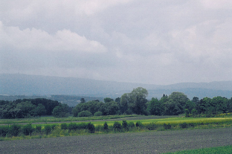 Anschliessend fährt sich's wieder leicht dahin, ausserdem wird uns gerade eine kilometerlange Abfahrt ins Vallee d'Orbe geschenkt. Über dem Jura - links voraus - braut sich ein Gewitter zusammen, wir haben noch 15 km bis Yverdon zu fahren, wo wir heute übernachten wollen. Aber diese 15 km sind brettl-eben, der Wind schiebt von hinten und es rollt einfach prima! Der Neuchateler See lässt sich schon erahnen, links sieht man am anderen Talrand ein grandioses Schloss mit vier runden Türmen stehen, doch allmählich verschwindet die Sonne hinter den Gewitterwolken und der Wind frischt auf. Aber da sind schon die Vororte von Yverdon erreicht und nach einiger Suche (es sind viele Touristen unterwegs...) finden wir Unterschlupf in einem Motel. Abends spazieren wir noch durch dieses wunderbare Städtchen und essen in einem italienischen Strassenrestaurant, es tröpfelt dazu und die violetten Gewitterwolken ergeben einen wunderbaren Kontrast mit dem von der Sonne beschienen Natursteinhäusern.