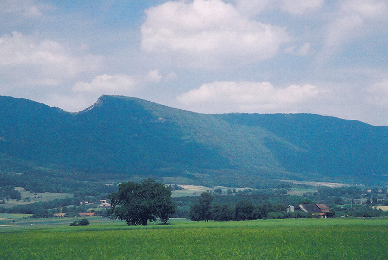 In der Annahme, dass wir entlang der Strecke eine Gartenbeiz nach der anderen finden würden, haben wir unsere Wasserflaschen am morgen nicht gefüllt, was sich jetzt rächt. Wir arbeiten uns durstig einige Anhöhen hinauf, geniessen die Aussicht über die Landschaft mit den blauen Jurahöhen im Hintergrund, sind enttäuscht weil wir in den Dörfern keine Wirtschaft finden, werden müde weil wir ein paar Kilometer lang eine langweilige Passage am Bahndamm entlang zu bewältigen haben, bis wie in La Sarraz endlich ein Café finden, dass mit Kaffee, Apfelschorle und Eis aufwarten kann. Das hebt natürlich die Stimmung gewaltig und lässt die Lebensgeister zurückkehren.