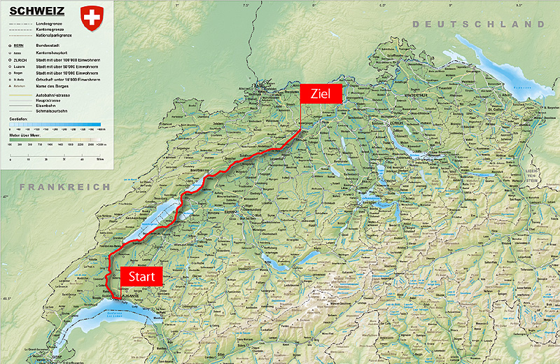 Im Winter ziehe ich komplett nach Zürich um, gebe mein Münchner Dasein auf und beginne in Zürich mit Margrit ein neues Leben - neue Wohnung, neue Umgebung, neuer Arbeitsplatz. Den ganzen April habe ich frei und ich freue mich schon darauf, eine längere Frühlings-Velotour zu unternehmen, aber das Wetter macht mir leider einen Strich durch die Rechnung und ausser ein paar kleineren Tagestouren liegt leider nichts für mich drin. Ende Mai bietet sich mit dem Christi-Himmelfahrt-Donnerstag ein längeres Wochenende an. Das Wetter soll schön bleiben, einer Tour steht nichts im Wege. Die voriges Jahr in Solothurn abgebrochene Reise kommt mir in den Sinn. Besonders die nicht "erfahrenen" Gegenden um den Bieler und Neuchateler See. Wir kommen überein, das Pferd von hinten aufzuzäumen und fahren am Donnerstag Morgen mit dem Zug nach Lausanne um von dort aus der ausgeschilderten "Mittellandroute" nach Norden zu folgen. Ich bin mit dem Pacer Arrow unterwegs, weil ich die Klettereigenschaften und das erheblich geringere Gewicht gegenüber dem Utopia London vorziehe.