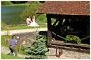 guter Einstieg ist? Im Laufe des frühen Abends trudelt dann die Hochzeitsgesellschaft ein und wir haben unserer Spass beim Beobachten des ringsum stattfindenden Treibens. Der 7.7.07 scheint in beliebtes Hochzeitsdatum zu sein: die ganze Zeit sind uns hupende Hochzeitskarawanen mit dem Brautauto vorne dran begegnet, oder aber Fahrzeuge mit geschmückten Antennen und Seitenspiegeln, deren Insassen wohl grad zur entsprechenden Fete unterwegs waren. Aber hier in der Moulin Bas: soviel fein gekleidete Leute aber auch! Leider hatte der Outfitberater des Bräutigams wohl nicht gerade einen seiner besten Momente, jedenfalls ist der Anzug des männlichen Hauptdarstellers etwas zu gross geraten und gibt seinem Träger trotz des sichtbar feinen Zwirns etwas Vogelscheuchig-Vom-Winde-Verwehtes. Das Brautkleid sitzt dagegen ganz gut, allerdings bleibt die Schleppe nicht allzu lange weiss, denn es hat hier die letzten Tage über geregnet und es werden natürlich Fotos am Teich gemacht und die Wege dorthin sind nicht asphaltiert Später hört man dann noch einen Alleinunterhalter. Der hat sich auf italienisches Liedgut spezialisiert und bringt von aktuellen italienischen Songs über 60er/70er Jahre Italohits (Azzzzuuuurrroooooo ) bis hin zu einem Arien-Medley aus diversen Verdi-Opern ein buntgemischtes Allerlei. Er ist sogar ein ganz akzeptabler Tenor. Allen Respekt! Den Leuten jedenfalls gefällt's und uns auch. Wir beschliessen den Abend aber trotzdem kurz nachdem die Mauersegler schlafen gehen und die ersten Fledermaus-Patrouillen auftauchen. |