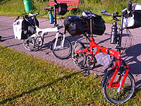 herum sitzen, wenn man eh schon reisefertig ist? Wie üblich bei Nordabflug gilt es erst den Bahnhof Oerlikon zu unterqueren und durch das "Glasscherbenviertel" jenseits des Bahnhofes zu rollen. Hier findet ein reges Nachtleben mit den dazugehörigen Auswüchsen statt und deswegen fährt man morgens entweder durch ausgedehnte Scherbenfelder oder kommt manchmal - durchaus auch bis in den späten Vormittag hinein - in Kontakt mit diversen Individuen, die den Weg (noch) nicht nach Hause gefunden haben. Jeder kann sich denken warum. Hat man das ohne Reifenpanne hinter sich gebracht, folgen die ersten Kilometer auf dem Radweg entlang der Glatt in Richtung Rhein. Hier gibt es sowohl kurze Kletterpartien als auch Naturwege mit teilweise ruppiger Oberfläche, man hat im Prinzip also einen Vorgeschmack darauf, was in den nächsten Tagen und Wochen auf einen zukommen mag. Wir können schon mal das Verhalten der bepackten Räder beurteilen und dieses Urteil fällt positiv auf. "Basst scho" sagt man dazu in Österreich. Den Flughafen hinter uns lassend, zweigen wir von der Glatt ab, radeln am Naturschutzzentrum Neerach vorbei und kommen bei Weiach schliesslich an den Rheinradweg. Ein paar Minuten später, in Kaiserstuhl, rollen wir die steile Altstadtgasse hinunter und setzen über den Rhein, der von jetzt an unser Begleiter sein wird. |