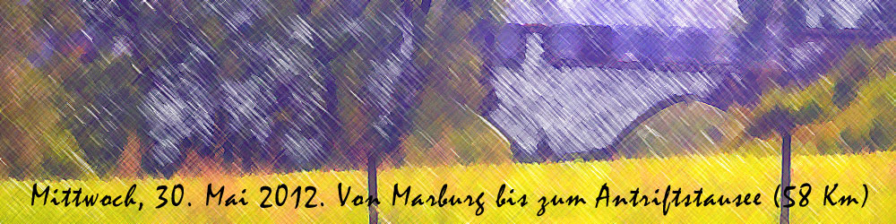 Es soll aber anders kommen. Wir umrunden die Lahnberge und die Landschaft wir allmählich weiter und leicht wellig. Schräg vor uns liegt ein Kegelberg, auf dessen Kuppe eine Festung zu sehen ist. Das ist Amöneburg. Lange ist diese markante Erhebung in unserem Blickfeld, während wir an Kirchhain vorbeiradeln und daraufhin Stadtallendorf anpeilen, wo mal wieder eine kleine Pause angesagt ist. Heute läuft es wieder mal so richtig gut und wir freuen uns über die Routenführung. Diese eher unbekannteren Radfernwege haben es - im positiven Sinne -in sich. Grad in Hessen sind mir bisher immer gut ausgeschilderte und befahrbare Wege begegnet. Dazu kommt noch, dass sie deutlich weniger frequentiert sind als die üblichen Klassiker. Nach Stadtallendorf radeln wir länger durch bewaldetes Gebiet, überwinden noch eine Hügelkette und überqueren die Wasserscheide Rhein-Donau, bevor wir etwas später das Tal der Antrift entlang fahren. Wenn man es nicht selber erlebt hätte, würde man die folgende Episode nicht für möglich halten. Jeder andere würde es als Effekthascherei bezeichnen, als billigen dramaturgischen Trick, und wenn jemand das hier nicht glauben will, so sei es ihm anheim gestellt. Und doch verhält es sich so: Um die Mittagszeit verdichten sich nämlich die Wolken ringsum und es liegt eindeutig ein Gewitter oder zumindest Regen in der Luft. Das erste Mal auf dieser Reise ziehen wir uns die Regensachen über und kurz darauf bricht auch schon ein sintflutartiger Platzregen los. Als das Spektakel beginnt, sind wir in der Nähe der Staumauer, die das Flüsschen Antrift zu einem See anstaut. Jetzt etwas zum Unterstellen, eine Gaststätte, vielleicht sogar |