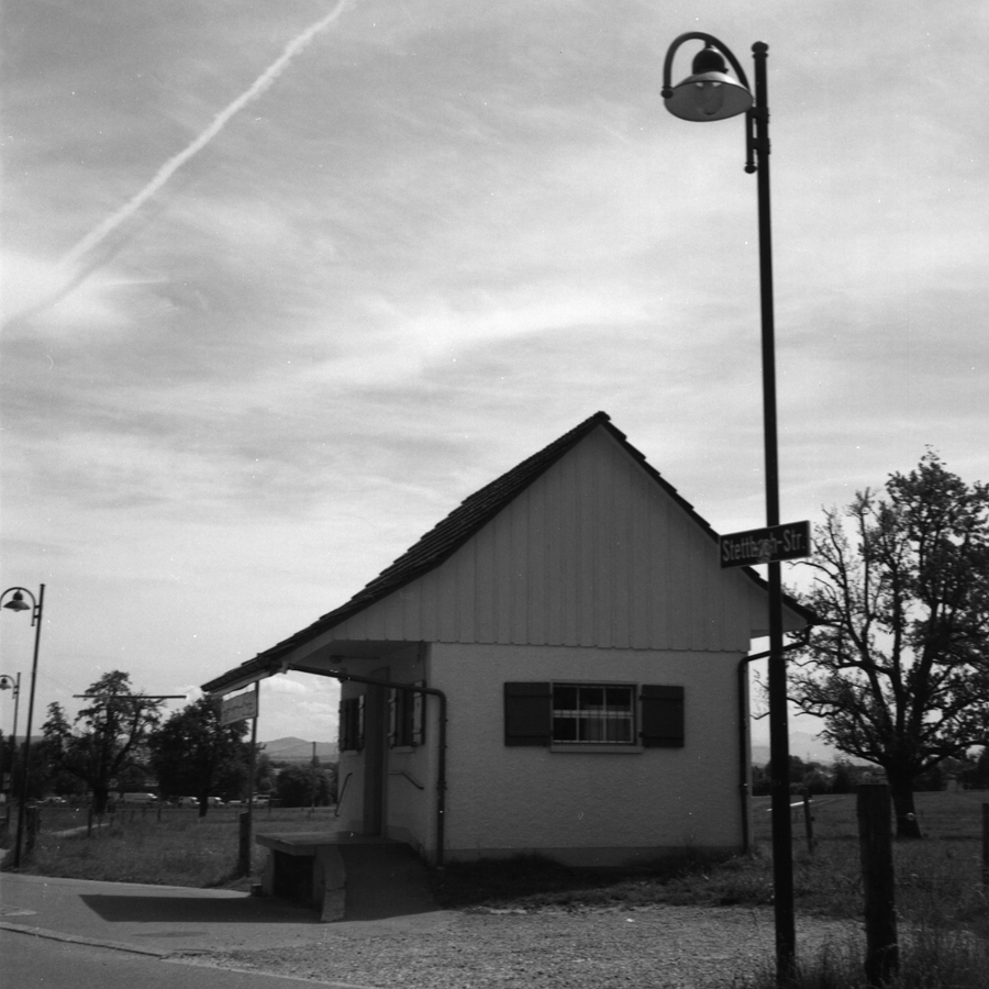 dann steht einem Spaziergang nichts mehr im Wege. Wir brechen auf, schlendern durch unser Wohnquartier und zum Waldrand, der gleichzeitig auch den Stadtrand markiert, geniessen bald einen Rundum-Blick über die nördlichen Ausläufer unserer Stadt, hören den ständig präsenten Verkehrs- und Baustellenlärm nur mehr gedämpft. Die Wiesen sind bunt, die zottigen Rinder kauen im Baumschatten wider, und der Himmel ist mit Schleierwolken überzogen. Am Montag wird es regnen. Heute ist auch eine gute Gelegenheit, sich mal wieder ein wenig mit der alten Rolleiflex zu beschäftigen, dich ich vor etwas mehr als einem Jahr (Rudi, ich denk an dich) geerbt habe. Ungewohnt, so zu fotografieren, mit dem Blick von oben in die Mattscheibe des viereckigen Kastens. Doch man gewöhnt sich daran. Wir laufen bis zum Ort Stettbach, mit seinem Mix aus alten Häuschen und neuen Wohnüberbauungen, und bis zum Bahnhof und nehmen die Tram wieder zurück nach Hause. |